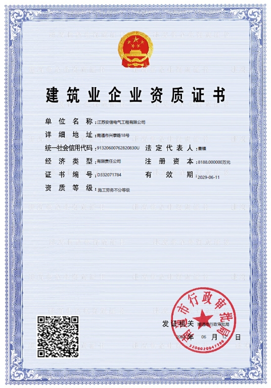 在創(chuàng)業(yè)之初,公司就堅持高起點的戰(zhàn)略思路,廣納賢才,集聚行業(yè)精英,創(chuàng)新發(fā)展,做優(yōu)企業(yè)品牌。現(xiàn)已取得:承裝二級、承修二級、承試二級,電力工程施工總承包二級,輸變電工程專業(yè)承包二級,建筑工程施工總承包二級,建筑機電安裝專業(yè)承包二級,地基基礎(chǔ)專業(yè)承包二級資質(zhì)證書,并通過了質(zhì)量、環(huán)境、職業(yè)健康和安全管理體系認證,確保各項工作有序管控。